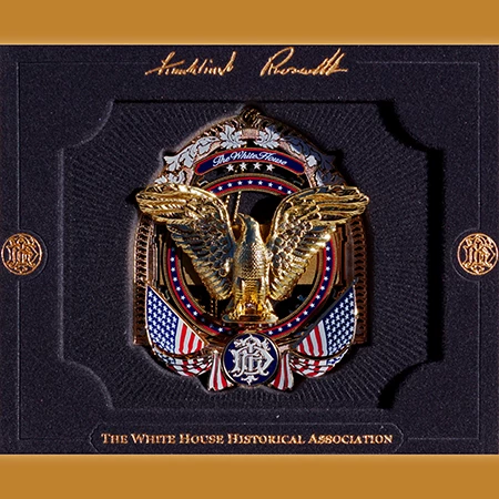 The Official 24 karat gold plated 2017 White House Christmas ornament honors the 32nd President of the United States Franklin D. Roosevelt who served from 1933 to 1945 and his remarkable journey to restore the faith of the American people. The ornament is crafted from shiny brass plated with nickel and 24-karat gold.