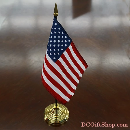 Our US Government Specified 4 inch x 6 inch Desk Flag comes with a black staff and a gold styrene base. This is a great item for all ages.