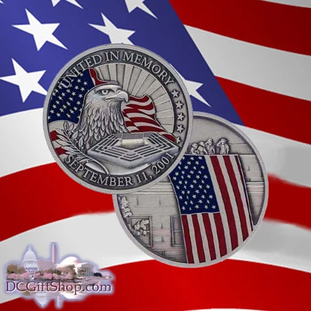 The front of the coin shows the Pentagon, American Eagle, and the American Flag with the words, “United in Memory” and “September 11, 2001”. The back of the coin shows an image of the American Flag being lowered over the side of the Pentagon.