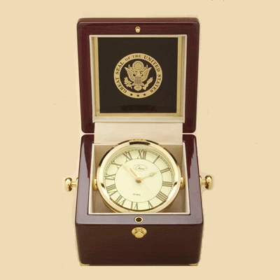 This elegant gold tone quartz time clock comes in a rich mahogany chest with high polish brass knobs and accent pieces. This chest captain’s desk clock is a handsome addition to your office or den and makes for a great presidential gift. The Great Seal of the United States is imprinted on the inside of the chest of this custom clock.
