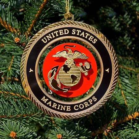 White House Christmas Ornament is proud to present our Official 24 karat gold plated Marine Corps Ornament. The center of the ornament features the Eagle, Globe, and Anchor Marine Corps Emblem. The Eagle is the symbol of the United States of America and is associated with with the Marine Corps. The Eagle proudly hold in its beak a streaming ribbon stating the motto of the Corps: Siemper Fidelis (always faithful or always loyal). The Eagle is perched on the top of the western hemisphere the Globe of our planet Earth. The Globe represent the Marin Corps the worldwide commitment of the Marine Corps and its areas of responsibility. Below the Globe, The fouled Anchor and Rope, whose origin dates back to the founding of the Marine Corps in 1775, represents the Marine Corps naval tradition.