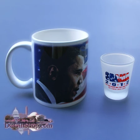 The Obama gift set comes with a patriotic red, white, and blue themed coffee mug and shot glass. The coffee mug comes with a portrait of President Barack Obama with an American Flag background with the words “OBAMA 2012” and the campaign slogan, “These Times Require More Than A Good Soldier They Require A Wise Leader”. The shot glass has a campaign theme with the words “OBAMA 2012” in red, white, and blue and also includes the campaign slogan listed above.