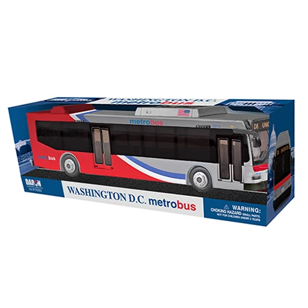 Our officially licensed model Metrobus operated by the Washington Metropolitan Area Transit Authority (WMATA) is made of durable hard plastic and rolling rubber wheels.
